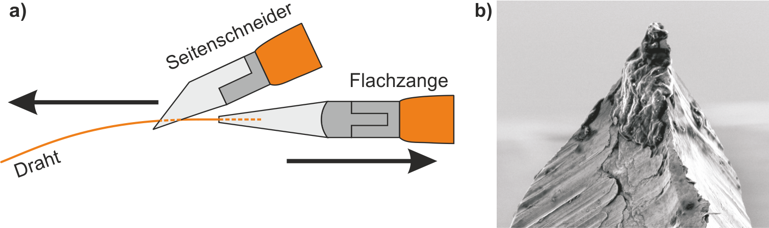 Für unsere Experimente wird für die Rastersondenspitze ein Draht aus Edelmetall genutzt, der sich aufgrund seiner geringen chemischen Aktivität besonders für Untersuchungen unter ambienten Bedingungen eignet. Da die edlen Metalle wie Platin (Pt) leider eine geringe Härte besitzen, wird etwas Iridium (Ir) beigemischt, um eine unbeabsichtigte Zerstörung der Spitze zu vermeiden. Um eine neue Spitze zu präparieren, wird ein 250 μm dicker 90%Pt-10%Ir-Draht auseinandergerissen. Der besondere Trick besteht darin, den Draht nicht zu zerschneiden, sondern zu zerreißen, da er auf diese Weise leicht zerfließt und die Scherkräfte eine im Vergleich zum zerschnittenen Draht dünnere Spitze ermöglichen (Abb. 2a). Auf diese Weise präparierte Spitzen sind meist weder sehr dünn noch besonders uniform (Abb. 2b), welches sie für eine Untersuchung von stark zerklüfteten Oberflächen sehr schwer einsetzbar machen kann.