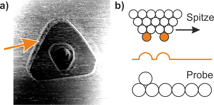 Ein häufiges Problem bei RTM-Spitzen stellt der Effekt der Doppel- oder Mehrfachspitze da. Ein solcher Effekt ist intuitiv verständlich, wenn wir uns erinnern, dass die RTM-Daten eine Faltung der Oberfläche mit der Spitze sind. Der einfachste Fall einer Doppelspitze ist in Abb. 1 schematisch dargestellt. Die Oberflächenstruktur wird "verdoppelt", d.h. beim Rastern wird eine einzelne Stufenkante zweifach abgebildet (siehe Pfeil). Die tatsächliche Spitzenstruktur muss keineswegs auf eine Doppelspitze beschränkt sein, es können drei, vier oder noch mehr "Spitzen" vorhanden sein, die manchmal auch nur an bestimmten Stellen der Oberfläche (wie z.B. atomaren Stufenkanten) sichtbar werden.