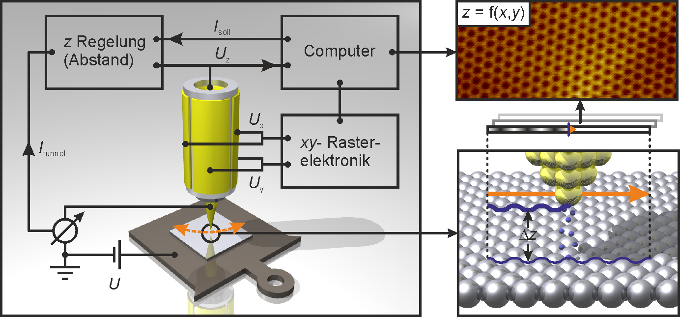 Im Rastertunnelmikroskop (RTM) wird eine feine Metallspitze als lokale Oberflächensonde verwendet. Der vordere Spitzenabschnitt kann mit Hilfe eines piezoelektrischen Stellelements in alle drei Raumrichtungen mit einer Genauigkeit im Sub-Ångström-Bereich positioniert werden. Gegenüber der Spitze befindet sich eine elektrisch leitende Probe, deren Oberfläche das Untersuchungsobjekt ist.