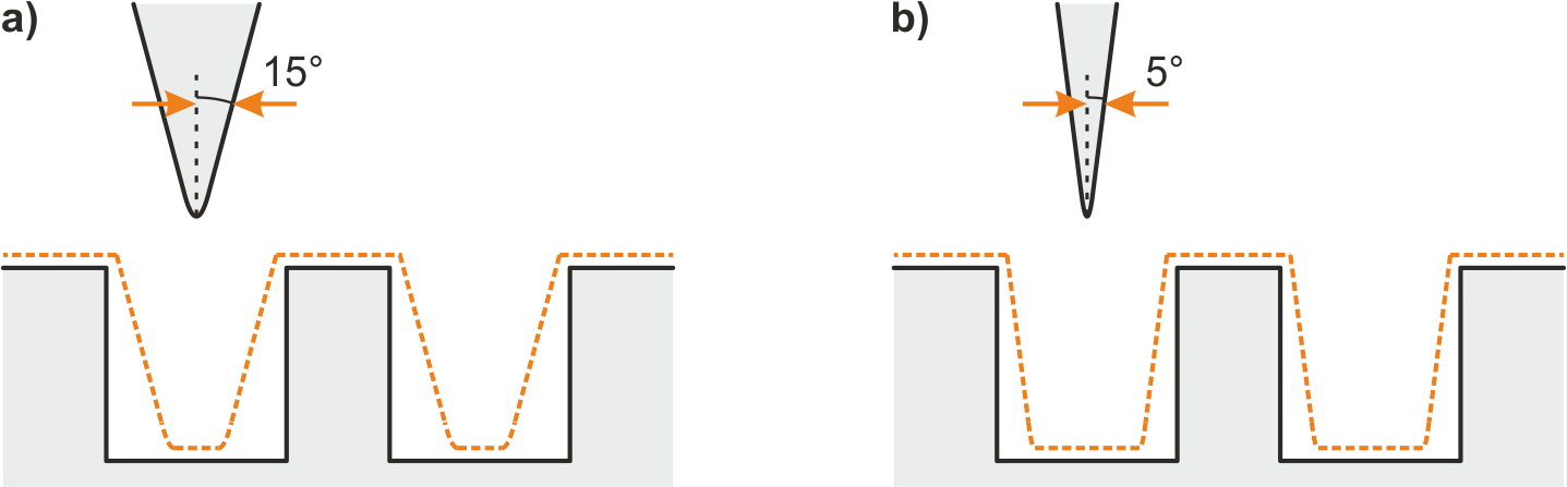 Die geometrische und elektronische Form der Spitze hat auf die Interpretation der gewonnenen Daten direkten Einfluss. Erinnert man sich daran, dass experimentell gewonnene Daten stets eine Faltung der zu messenden Größe mit dem Messgerät sind, wird die Bedeutung der Spitze intuitiv klar. Die am Rechner dargestellten Profile sind nicht reine Oberflächentopographien, sondern eine Faltung der Oberflächentopographie mit der Spitzengeometrie (Abb. 1). Anhand von Abb. 1 kann man intuitiv verstehen, warum verschiedene Untersuchungen verschiedene Spitzentypen erforderlich machen. Interessiert man sich beispielsweise für eine sehr raue Oberfläche, ist eine sehr lange dünne Spitze erforderlich, um ein möglichst genaues Abbild der Probenoberfläche zu erhalten. Zum Beispiel können hohe Stufenkanten nur aufgelöst werden, wenn die Spitze scharf genug ist, um ihre Konturen exakt nachfahren zu können. Anderenfalls wird der Tunnelstrom an den Kanten von Atomen an der Seite der Spitze getragen und dementsprechend der $z$-Abstand zur Oberfläche auf konstanten Tunnelstrom geregelt. Untersucht man eine glatte Oberfläche, so ist die makroskopische Form der Spitze von untergeordneter Bedeutung, da die Seiten der Spitze in keinem Fall zum Tunnelstrom beitragen.