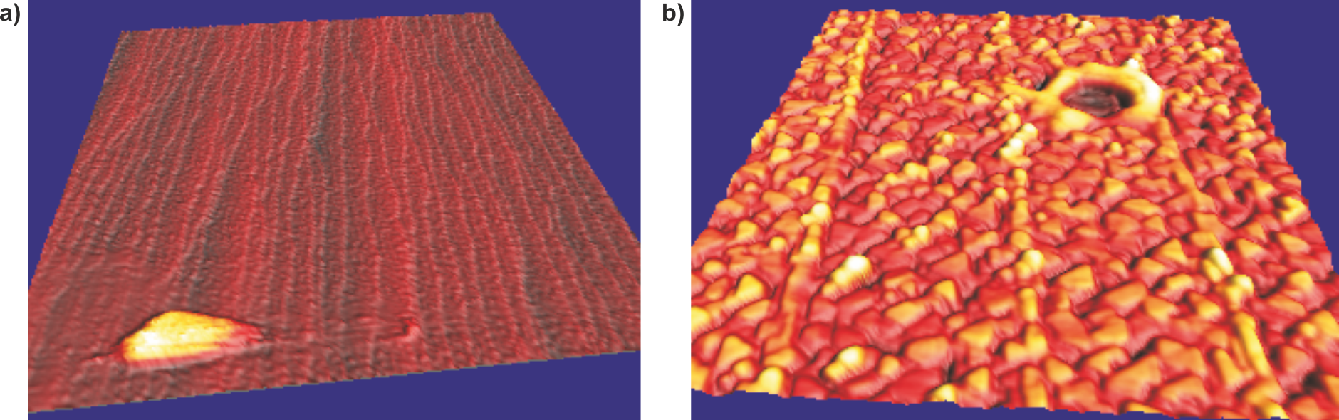 Ein Spitzen-Proben-Kontakt kann nicht immer verhindert werden. Deshalb braucht man Möglichkeiten, die Spitze zu optimieren, ohne gleich eine neue anfertigen zu müssen. Besonders in einem Ultrahochvakuum-Messplatz ist ein Wechsel der Spitze meist mit einem Belüften und Öffnen des Systems verknüpft, was natürlich vermieden werden soll, da sonst das Vakuum erst wieder neu erzeugt werden muss. Ein weiteres Problem stellt die Beurteilung einer Spitze dar, es muss nämlich das atomare Ende beurteilt werden, was RTM-Bilder mit einer Auflösung im Ångström- Bereich erfordert. Somit ist die wirkliche Qualität der Spitz i.A. erst bei den ersten Messungen mit dem RTM zu erkennen. Eine extreme Möglichkeit der Spitzenveränderung besteht darin, bewusst einen Spitzen-Proben-Kontakt herbeizuführen und somit die Form der Spitze zu verändern. Eine schonendere Methode stellt das sogenannte Pulsen da. Hier wird die Rückkopplungsschleife vorübergehend deaktiviert und die Tunnelspannung kurzzeitig erhöht. Daraus resultiert ein relativ hohes elektrisches Feld im Tunnelkontakt, was je nach Polarisation der Spannung zu einem Transfer von wenigen Atomen von der Spitze zur Probe oder umgekehrt führt. Die Auswirkungen der Pulse werden in Abb. 3 am Beispiel zweier Probenoberflächen gezeigt. Man sieht, wie "Täler" oder "Berge" auf dem Substrat entstanden.